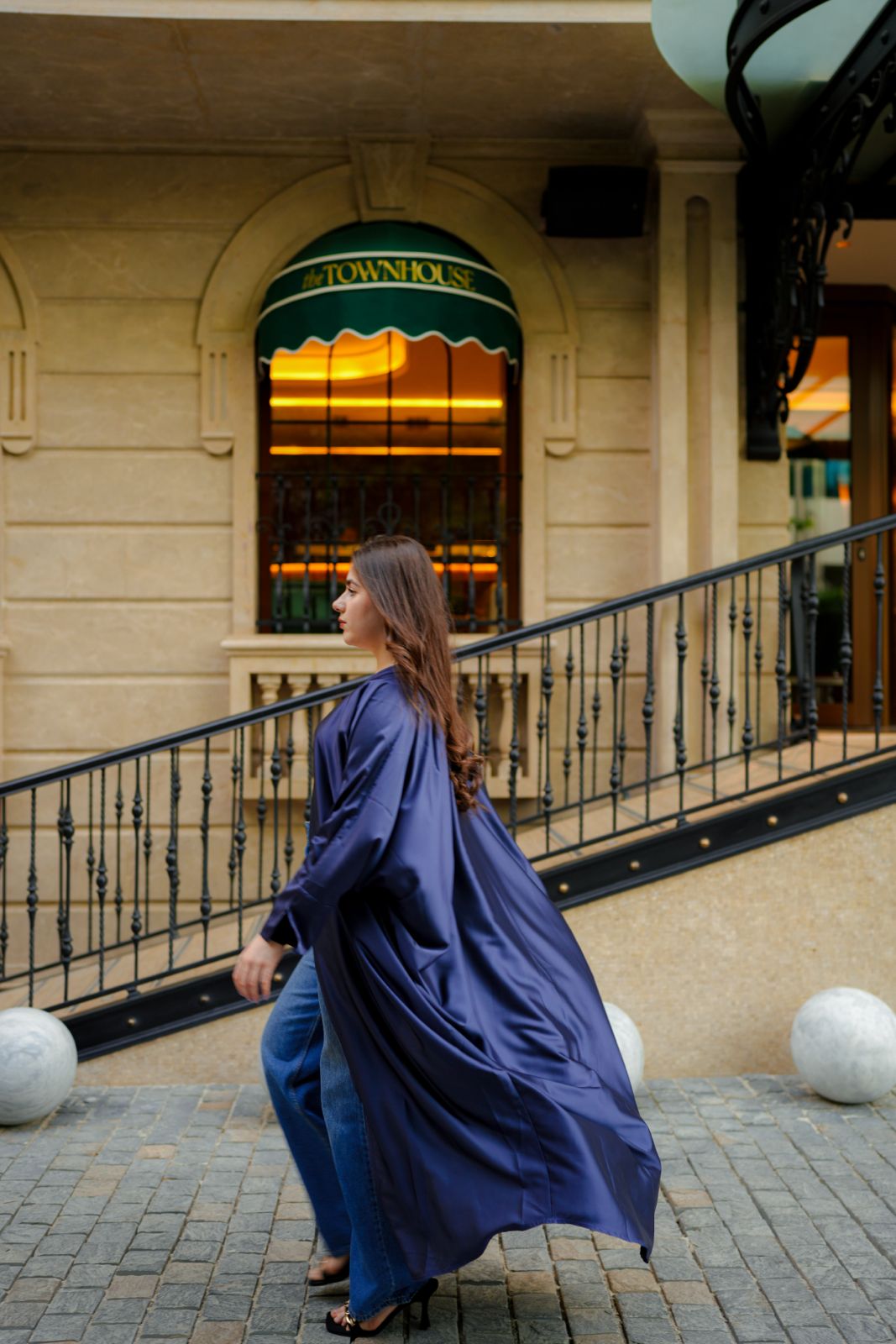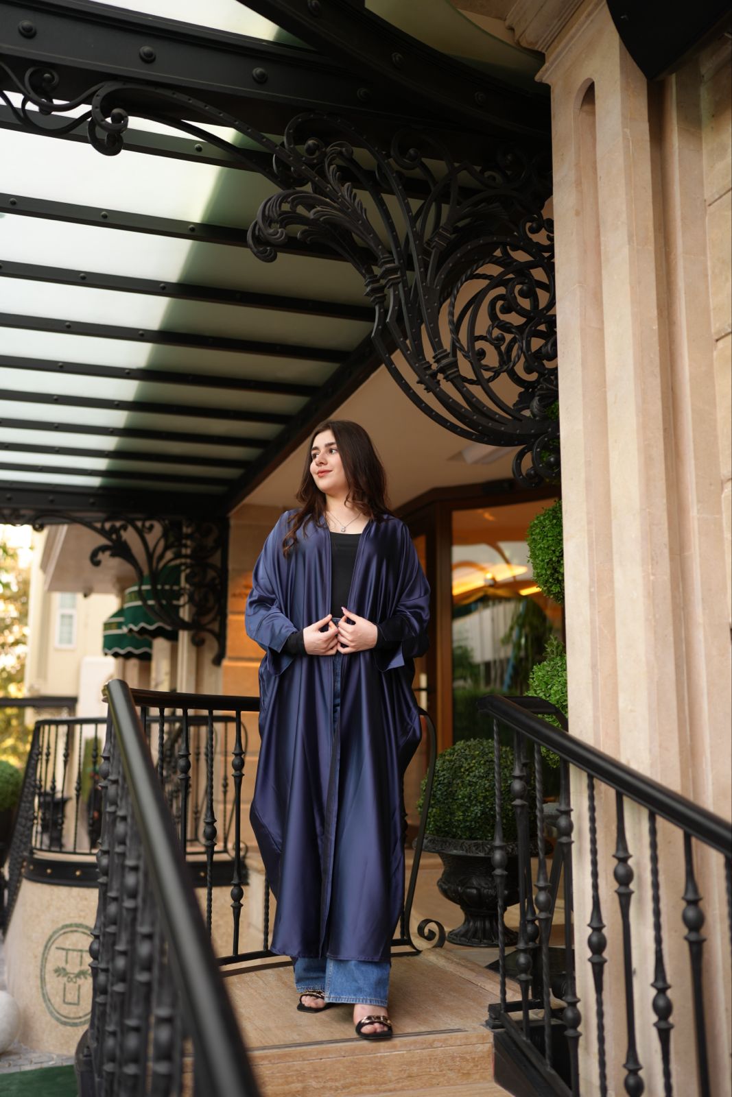 A serene blue silk abaya that embodies tranquility and poise, flowing with grace.